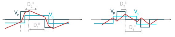 只要开关在软开关模式下运行,相移双有源电桥转换器就能有较高的效率。当次级侧电压发生变化时(例如交流侧的正弦波),很难实现这一点。TIDA-010954 中实施了两种相移控制方法。下面的 IEEE 论文中说明了控制方法。对于大功率,在交流峰值附近实施“模式 II”。对于小功率(交流斜率和交流信号的过零点),则使用“模式 III”。模式 II 和模式 III 的相移控制差异如图 3-1 所示。