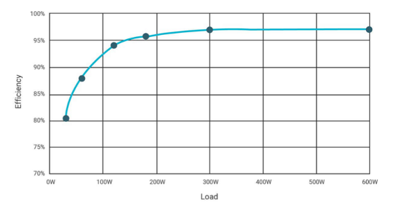 不同负载条件下的测试是一个重要的性能参数。转换器不仅需要在满载和 50% 负载条件下实现高效率,还需要在较轻负载条件下实现高效率。图 3-5 给出了测得的效率曲线。峰值效率约为 97%。