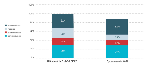 系统成本是微型逆变器或便携式电源站设计的一个重要考虑因素。本节深入探讨了从基于 SiFET 的两级转换器迁移到基于 GaN 的单级转换器如何对系统成本产生积极的影响。在循环转换器中,可以减少电源开关的数量。对于推挽式和反激式转换器,直流侧使用的开关额定电压需为 170V;而对于循环转换器,单面板输入的额定电压可为 100V。这种新型循环转换器的工作频率范围在 300kHz 到 600kHz 之间。这意味着,与两级转换器相比,磁性元件设计(变压器和电感器)要小得多。“两级”转换器的工作频率通常低于 100kHz,以保持较小的 SiFET 开关损耗。此外,与全桥交流/直流转换器相比,循环转换器接入电网所需的 EMI 滤波器要小得多。这就降低了总体成本。图 4-1 展示了成本比较。推挽式转换器的成本用作相对比较的 100% 基准。