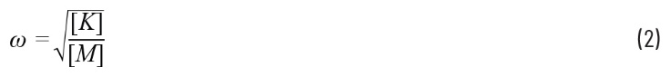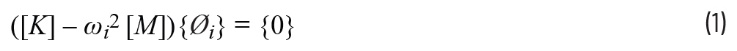 方程1为质量矩阵[M]、刚度矩阵[K]、角频率ωi和振型{∅i}的关系式,用于诸如ANSYS的FEM程序进行计算。ωi除以2π,可以计算得出固有频率fi,振型{∅i}提供特定固有频率下材料的相对变形模式。