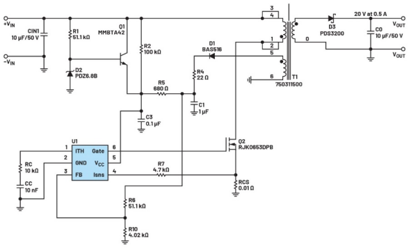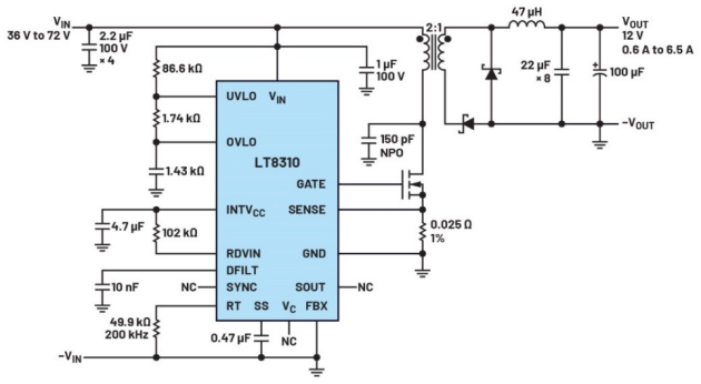 图3.LT8300无光耦反激应用电路(36 V至72 V VIN,5 V VOUT)