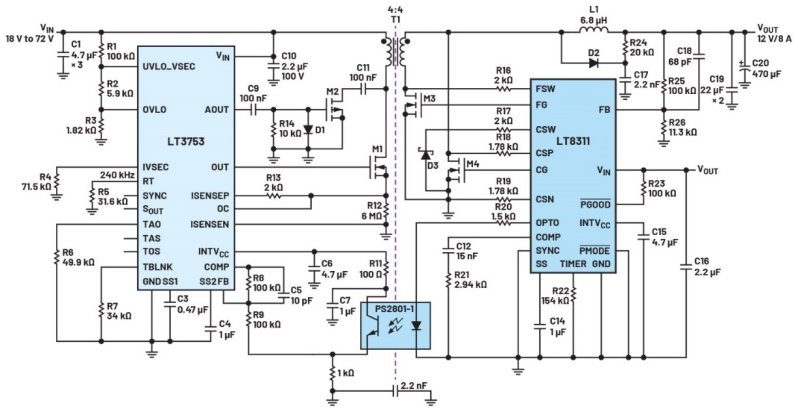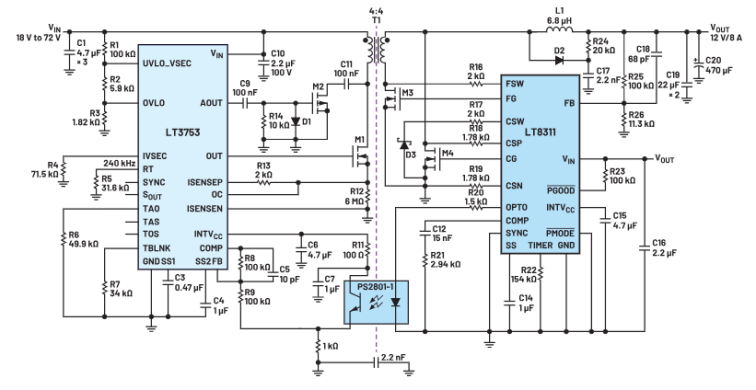 正激式和反激式转换器均无需次级侧控制器,而是利用次级侧(变压器的隔离侧)的一个二极管(正激式转换器需要两个)来工作。然而,这不一定是最有效的方法。另一种方法是用低损耗MOSFET取代二极管,此时需要次级侧控制器。它是一种开关控制器,用于控制隔离栅次级侧MOSFET的通断。有些开关控制器(如LT8311)可能包括额外的电路来监测输出电压,并将此信息提供给隔离栅的初级侧。信息传输通过光耦合器信号实现。图6展示了一个应用电路,其中LT3753正激转换器与LT8311配合使用,通过光耦合器反馈实现次级侧控制。
