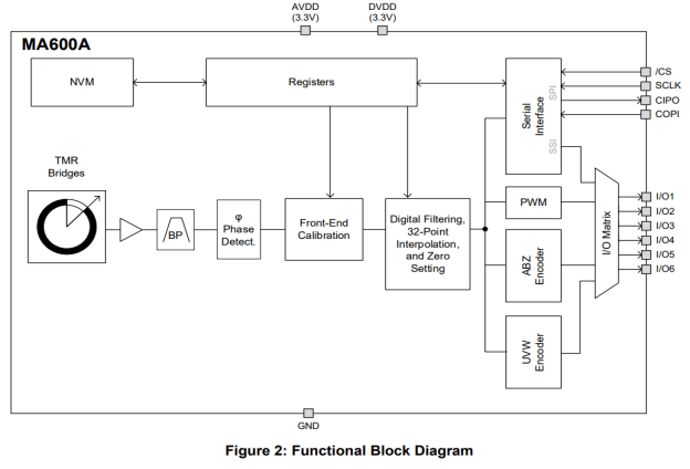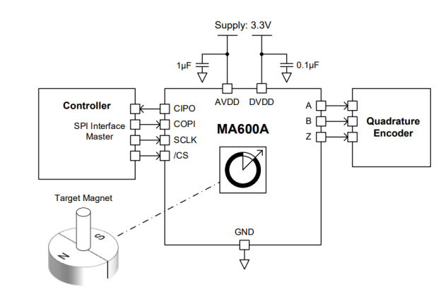 MA600A的工作电压为3V至3.6V,通信接口支持SPI、ABZ、PWM、UVW以及SSI,适用于多种通信协议场合。其支持菊花链配置,配置更加灵活,通过AEC-Q100认证,安全可靠。