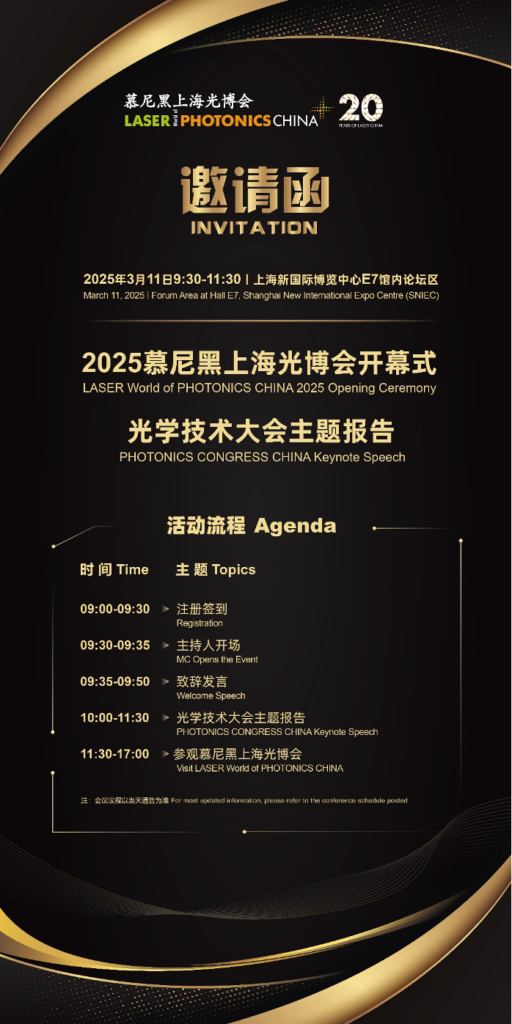 光学技术大会 PHOTONICS CONGRESS CHINA 将与慕尼黑上海光博会共同于2025年3月11-13日在上海新国际博览中心举办。本届大会议题丰富,聚焦行业热点话题,主题包括计算光学成像技术、超构光学表面技术、半导体光学技术、光学微纳检测、红外探测技术、激光器、激光技术等最新科技研发成果和进展,同时大会将聚焦半导体、新能源、汽车工程、人工智能、生物医疗等应用场景,更有多个光学主题培训班的加入,为光电人带来更多专业课程。