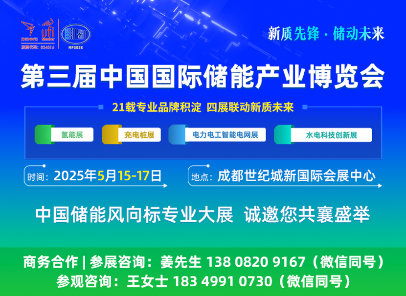 2025年5月17日14:00,由中国电力企业联合会指导、中国国际贸易促进委员会电力行业委员会主办、四川省电力行业协会特别支持、成都振威世展展览有限公司承办第三届中国国际储能产业博览会(简称“四川国际储能展”)在成都世纪城新国际会展中心圆满闭幕。