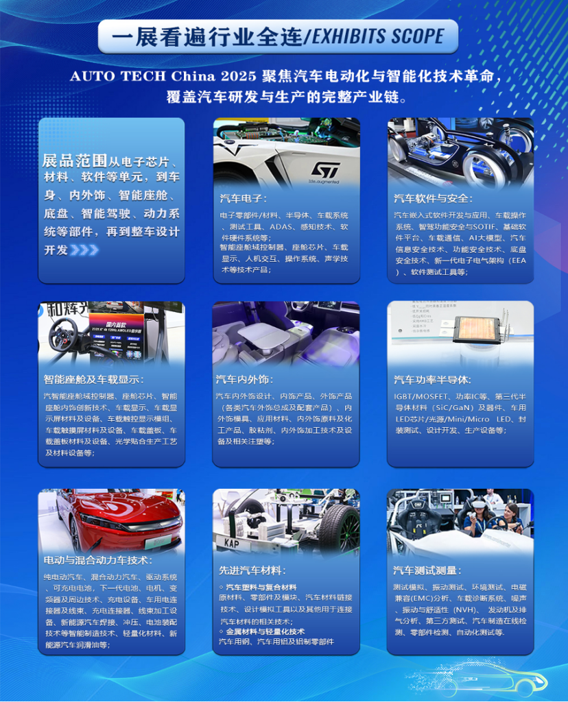 AUTO TECH China 中国国际汽车技术展览会是由汽车技术相关的展览及高峰技术论坛组成,本次展会预计展览面积达数万平方米,将吸引超过 500 家参展商前来展示其最新成果,预计将有超 30000 名专业观众到场。展会内容丰富多元,涵盖汽车电子、车用功率半导体、智能座舱、汽车材料、汽车软件与安全、新能源汽车、汽车测试测量以及汽车内外饰等汽车工业多个重要领域。作为汽车科技创新展示平台,组委会将邀请诸如广汽、比亚迪、日产、丰田、本田、特斯拉、小鹏、蔚来、理想、东风、长安、上汽、吉利、长城、奇瑞、小米、奔驰、宝马 、大众、一汽、博世、大陆、宁德时代、电装、德赛西威、华为技术等汽车OEM制造商及Tier 1 零部件供应商的上万名采购、技术工程师汇聚一堂,参加展会。