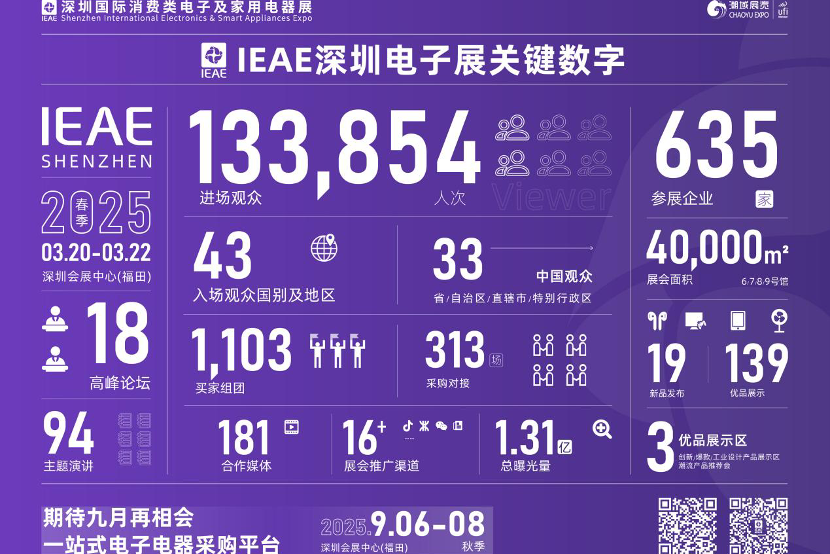 在今年3月的春季展会中,IEAE深圳电子展吸引了逾千家国内电子电器品牌企业与创新势力同台竞技,吸引来自全球43个国家及地区的超13万人次专业观众到场观展采购,现场交易与意向合作金额创下新高。