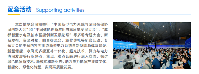本次博览会同期举行“中国新型电力系统与源网荷储协同创新大会”和“中国储能创新应用与高质量发展大会”、“成都智慧水电及抽水蓄能创新发展论坛”等多场专题大会、新品发布、资源对接、圆桌交流会、颁奖典礼等配套活动。专题大会的主题内容将围绕新型电力系统与新型能源体系建设、新型储能、水风光多能互补一体化、超充技术、算力与电力协同发展等行业热点、焦点、难点话题进行深入交流,探讨绿色能源新技术、新模式和新业态,助力电力能源产业数字化,智能化、绿色化转型,实现高质量发展。
