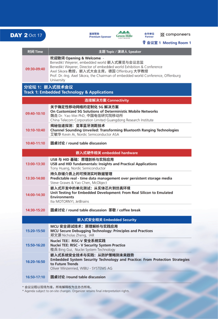 演讲涵盖连接解决方案、嵌入式操作系统、安全保障、系统及软件工程、嵌入式AI与智能系统、嵌入式人机界面、系统级芯片(SoC)设计、嵌入式技术的跨界应用案例、Yocto与Zephyr。