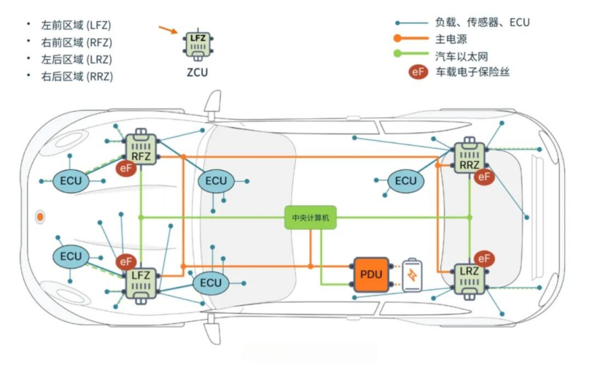 随着车内电子系统的不断增加, 电力分配变得更加复杂, 线束的设计难度也大大增加。 基于域的传统布线方法将相似功能(动力系统、 底盘、 信息娱乐系统、 车身和舒适度系统等) 连接到一起, 如今已不够高效, 也不够灵活。汽车行业正在从集中式配电转向分布式区域配电。 传统上分散在车内各处的众多 ECU 如今可由区域控制器 (ZCU) 取代。