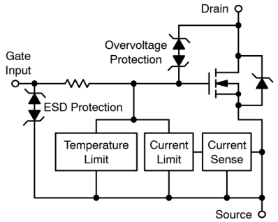 NCV841x 系列具有非常平坦的温度系数, 可在 -40℃至 125℃ 的温度范围内保持一致的电流限制。 由于基本不受温度影响, 因此无需为应对寒冷天气条件下的电流增大而选择更粗的电线。 电线尺寸减小有助于降低车辆线束的成本和占用空间。过电流、 过压保护, 集成漏极至栅极箝位和 ESD 保护。