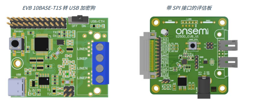对于 NCV7410 10BASE-T1S 以太网收发器, 当前已有两款评估板 (EVB) 可用于评估。 如需获取评估板和配套的软件图形用户界面 (GUI), 请联系安森美销售人员。 评估板按连接方式分为两种版本: