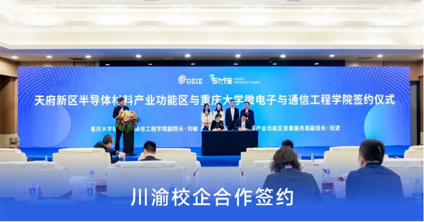 2023年5月10日同期大会上,天府新区半导体材料产业功能区与重庆大学微电子与通信工程学院签署《校地合作协议》,与重庆启迪高开科技园签署了《战略合作协议》,助力打造互促共兴的产业新生态。
