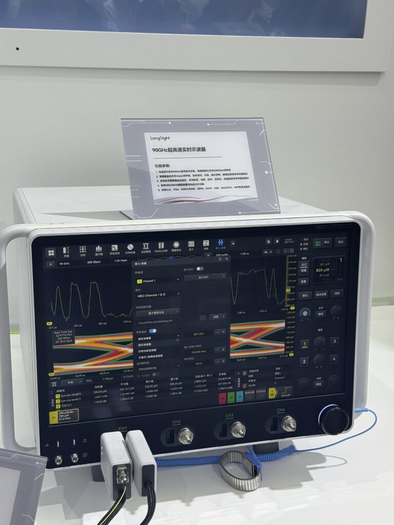 此次展台 C 位的 90GHz 超高速实时示波器,是万里眼自主研发的突破性产品。这家成立于 2023 年 9 月的子公司,由新凯来持股 91.47%,80% 员工为研发人员,在 CEO 刘桑带领下实现技术跨越。该示波器带宽突破 90GHz,将国产同类产品性能提升 500%,仅次于国际最高的 110GHz 水平,打破了西方《瓦森纳协定》的技术封锁。其搭载 200GSa/s 独立采样率与 4Gpts 深存储容量,能捕捉头发丝直径百万分之一的信号变化,适配 6G 通信、半导体芯片测试等高端场景。