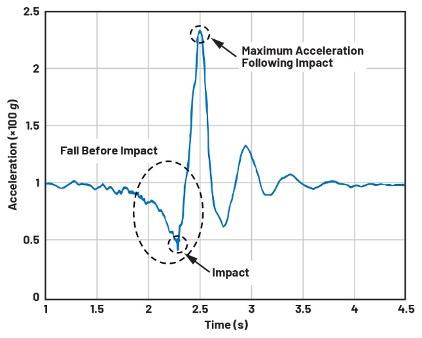图1.手持设备跌落测试的典型加速度水平。请注意,最大加速度出现在实际冲击后。
