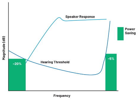 借助动态扬声器管理(DSM),开发人员能够将微型扬声器的输出提高2.5倍,既不增加功耗,也不会对安全工作条件产生负面影响。通过使用带有集成升压转换器的紧凑型、低功耗、高效D类音频放大器,这一目标不难实现。此类架构利用感知功耗降低(PPR)的概念来延长电池续航时间:通过利用DSM产生的扬声器声压级(SPL)响应,再结合人类听觉阈值(参见图3),可以动态衰减最终用户听不到的信号。与传统静态滤波器相比,衰减这些信号可节省10%至25%的功率(参见表1)。