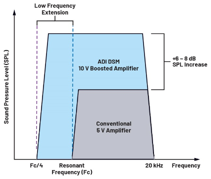 图4.与配备传统放大器的相同扬声器相比,MAX98390等DSM放大器可使SPL提升高达8 dB。