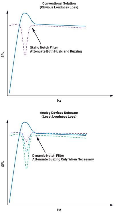 图5.由于动态陷波滤波器仅衰减机械震动与端口共振的相互作用,而不衰减声音和嗡嗡声效果,因此与传统陷波滤波器相比,它可以产生更清晰、更洪亮的声音。