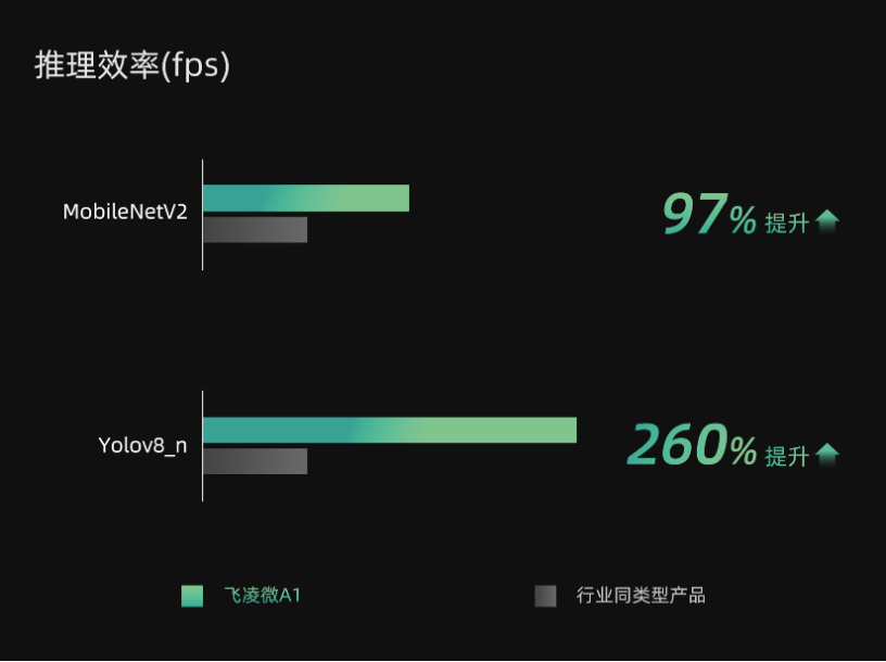 飞凌微A1芯片搭载了0.8TOPS@INT8轻算力自研NPU,支持业内主流的CNN架构,并对轻量级神经网络结构和视觉任务进行了优化。相较行业同类型产品,A1芯片在轻量级分类模型、检测模型的推理效率分别大幅提升了约97%和260%,能进一步帮助智能视觉感知应用提升视觉数据处理计算的准确性和效率。