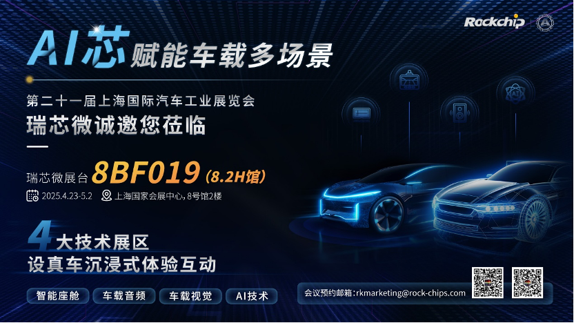 诚邀您莅临瑞芯微在 2025 上海国际汽车工业展览会(4月25日-5月2日,上海国家会展中心)的展位(8BF019 Hall8.2H)亲身体验最新车载音频解决方案,共探行业前沿技术。