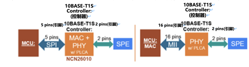 图 2:三个 10BASE-T1S 控制器,MAC+PHY 和仅 PHY