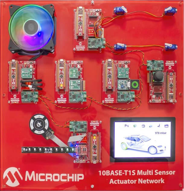 为了展示 10BASE-T1S 以太网的实际应用,Microchip开发了一个演示,展示如何使用该技术连接车辆内的各种传感器和执行器。该演示包含压力、接近、光线和其他传感器,它们可以捕获真实世界的数据,然后由集中式计算平台进行处理。处理后的数据用于控制电机、风扇、灯光和显示器,进而与物理世界进行交互。图 3 展示了演示板。