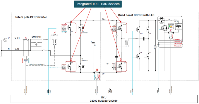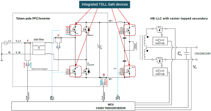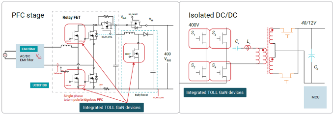这种情况成为集成 650V TOLL 器件的典型用例,主要通过 PFC 和 DC/DC 级将交流电源转换为直流总线,如 图 2 所示。对于前面提到的拓扑,我们采用 TOLL 封装的 GaN 器件可在 PFC 级实现超过 99% 的效率,在 DC/DC 级实现超过 98% 的效率。