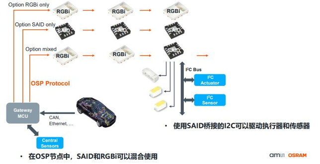 在OSP生态中,RGBi模块可以与SAID(独立智能驱动器)混用,实现更加丰富的功能和应用。例如,通过SAID的I2C可以驱动执行器和传感器,使得OSIRE® E3731i不仅能够用于照明,还可以与传感器等其他设备协同工作,实现更加智能化的交互体验。