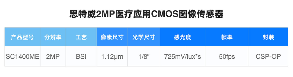 2025年6月5日,中国上海 — 思特威(上海)电子科技股份有限公司(股票简称:思特威,股票代码:688213)近日宣布,全新推出2MP超小尺寸医疗应用CMOS图像传感器——SC1400ME。此款新品基于思特威先进的SmartClarity®-3技术平台打造,搭载了思特威专利SFCPixel®技术,具备高色彩还原度、高感度、低噪声、低功耗等多项性能优势,能够为医疗内窥镜摄像头带来清晰稳定的高质量彩色影像。SC1400ME封装尺寸仅约1.9mm×2.5mm,可适用于胃肠镜、腹腔镜等多种医疗内窥镜设备,全面助力医疗影像能力升级。