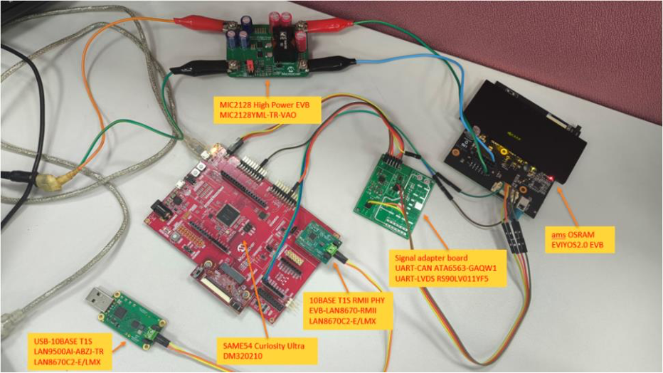 - Microchip ATSAME54:运行FreeRTOS系统,通过高速USART对EVIYOS进行配置和视频数据通信。通过以太网RMII接口外接LAN8670 10Base T1-PHY实现10M车载以太网通信;