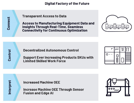 最后一项战略聚焦于解读。解读战略旨在将生产数据转化为可付诸实践的洞察信息,从而助力实现未来工厂的各项目标。据估算,制造业每年产生的数据量约达1812 PB(拍字节)。2 解读战略将运用人工智能技术来处理这些海量制造数据,以提升生产效率。解读战略的关键在于在数据产生的边缘侧部署人工智能。边缘人工智能将通过主动决策,结合传感器融合(包含工业视觉、温度、压力/力、测斜仪、位置、振动、湿度等测量方式),实现制造业的自主优化。边缘人工智能将通过自动执行常规任务,减少对熟练劳动力的依赖,并以尽可能高的良品率实现更具个性化和复杂性的制造。关键应用包括引导驱动(移动机器人)、缺陷或异常检测(机器健康状况)、持续的工艺改进、模式识别(质量控制),最终还将融入自动化控制循环,成为其中重要一环。