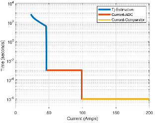 SiC的电子熔丝演示板实现了快速响应时间,将短路电流限制在仅几百安培。借助宽带宽电流检测电路并使用默认设置,它可在 700 纳秒内检测到短路,并在 1 至 6 微秒范围内清除故障(具体取决于系统电感)。图 2 中时间-电流特性(TCC)曲线定义的跳闸行为可通过软件或本地互连网络(LIN)配置。TCC 曲线包含三种检测方法:结温估算、基于模数转换器(ADC)的电流采样以及可通过软件配置的硬件检测电路。