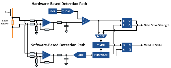图 3 中的检测电路包括一个带有开尔文检测连接的分流电阻器(用于提供精确的电压测量)、一个具有高增益带宽积的运算放大器、一个具有可配置基准的快速比较器以及一个置位-复位 (SR)锁存器,以实现快速短路检测和保护。对于不需要立即响应的过载,电流检测信号由单片机的 ADC 和固件处理。该设计包括两种工作模式:边沿触发模式或穿越模式。在边沿触发模式下,超过阈值的过流会触发立即关断。在穿越模式下,过流会立即将SiC MOSFET 栅极驱动至较低电压,以延长其短路耐受时间。如果过流持续时间超过预定义的可配置持续时间,则SiC MOSFET 将关闭,从而中断电路。但是,如果电流降至阈值以下,MOSFET 栅极将被驱动回全栅极驱动。