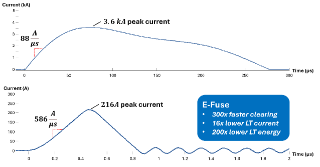 图 4 显示了使用传统 30A 和 30A E-Fuse 演示板进行充电电容短路测试时的允通电流。为了证明快速响应时间,E-Fuse 在更恶劣的工作条件下进行了测试,源电感降低了六倍,这导致电流斜坡比熔丝测试中的陡度高六倍。即使在这种情况下,E-Fuse 测试中的短路电流峰值也仅为216A,而熔丝允许的峰值电流为 3.6 kA。E-Fuse 的总故障清除时间为 672 ns,传统熔丝的总故障清除时间为 276 µs。除了快速的故障清除时间允许较低的短路允通 (LT)电流之外,允通能量也比传统熔丝低数百到数千倍。本次测试中,电子熔丝的允通能量为 406 mJ ,而受熔丝保护的电路的允通能量仅为 85J。这种显著的性能差异有望在采用电子熔丝保护的情况下,防止故障负载演变为硬故障。