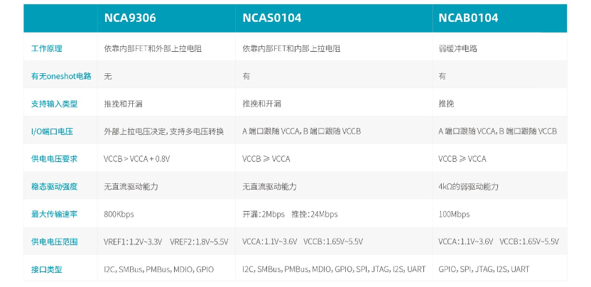纳芯微可提供多种类型的电平转换器,包括:固定方向型、方向控制型、自动双向型,可满足客户在不同应用场合下的设计需求: