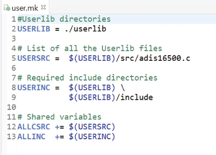传感器驱动程序没有通用的组织结构。图1所示为建议的文件夹结构。userlib文件夹中包含所有传感器驱动程序。在本示例中,只有IMU传感器驱动程序,但如果项目包含更多传感器,组织方式基本相同。userlib中有两个文件夹,分别是include和src。include文件夹包含驱动程序的标头文件,即本例中的adis16500.h,而src中包含源文件,即adis16500.c。userlib中还有一个指定include指令的makefile,如图2所示。