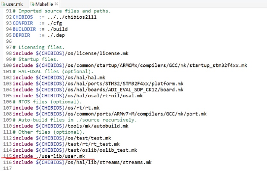 图3所示为主makefile。它位于应用层,靠近main.c。该makefile包含user.mk,如图3中红色下划线所示(代码第115行)。