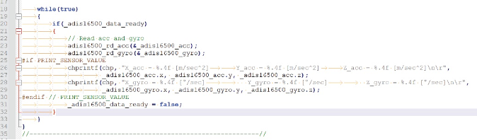 在此示例中,main.c中有一个无限循环,始终检查名为_adis16500_data_ready的布尔静态变量。该变量与回调函数相关,当DR引脚变为高电平时,它将切换到TRUE,这意味着已有新数据可用。在这种情况下,主函数将调用adis16500_rd_acc和adis16500_rd_gyro函数。通过全速运行IMU传感器,设计人员将能够以2 kHz的输出数据速率(ODR)获取数据。