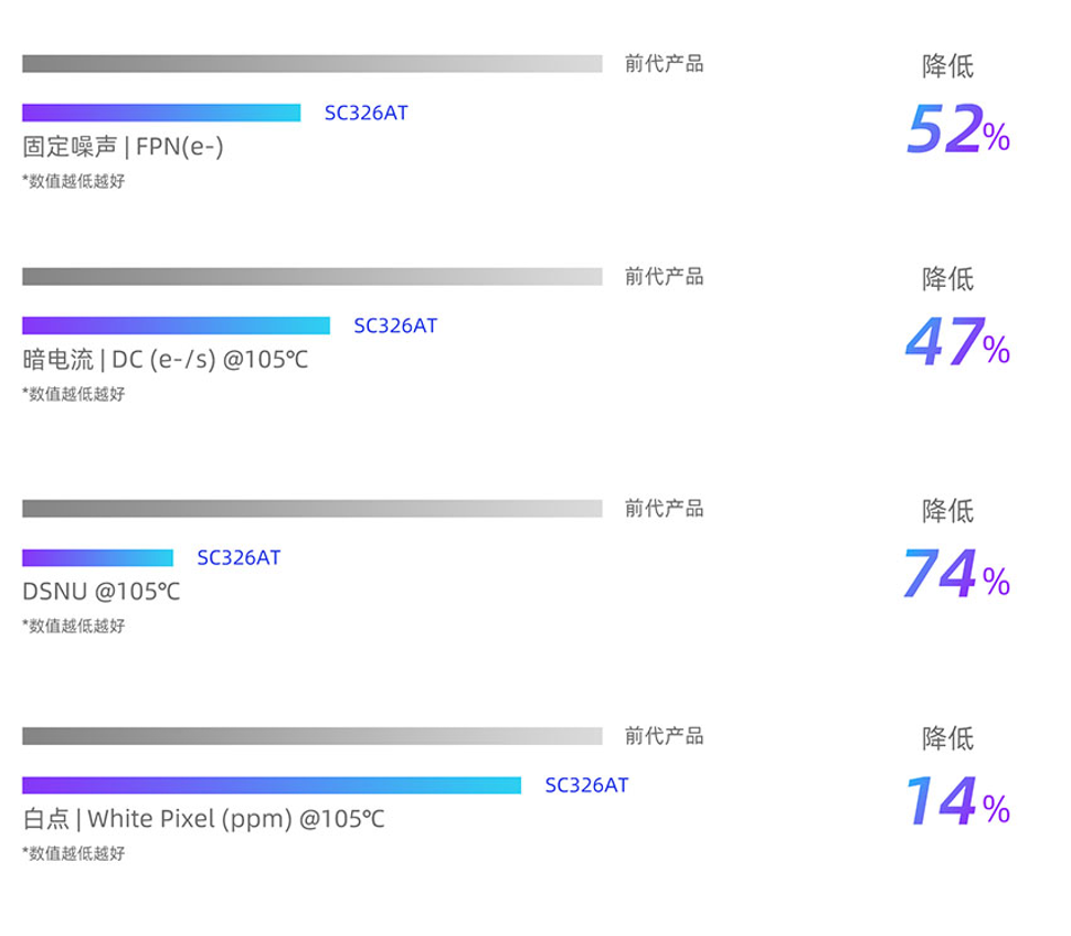 SC326AT基于思特威先进的CarSens®-XR工艺技术、SFCPixel®技术和读取电路架构优化设计,在噪声抑制和高温成像稳定性方面实现了性能提升。在最大增益模式下,SC326AT的固定噪声(FPN)较前代产品大幅降低约52%,能够让车载摄像头在暗光环境下的成像更清晰干净。同时,SC326AT在105℃高温环境下的暗电流(DC)、DSNU和白点(White Pixel)分别降低约47%、74%和14%,在面临高温长时间运行环境时能为车载摄像头提供稳定、可靠的实时影像信息。
