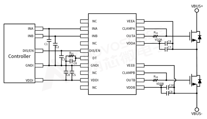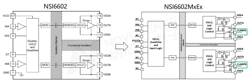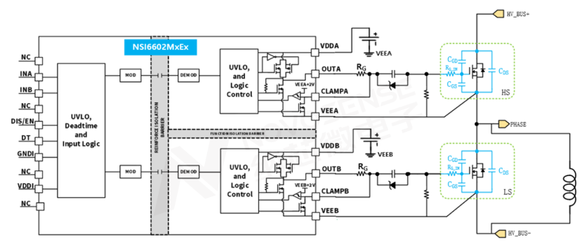 纳芯微推出NSI6602MxEx系列,为两路半桥驱动电路集成5A能力的米勒钳位功能,能够为米勒电流提供最小阻抗释放路径,有效抑制串扰电压的抬升。NSI6602MxEx在NSI6602基础上全副武装,为SiC等器件的安全应用保驾护航。