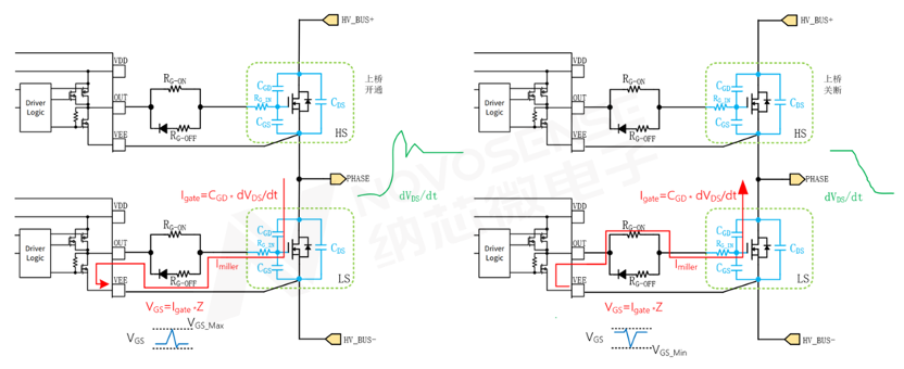 在实际应用中,OBC/DCDC、工业电源、电机驱动等桥式电路的功率器件容易发生串扰行为,尤其伴随着第三代功率器件如SiC和GaN的应用,门极阈值电压以及最大耐受负压双双减小,使得抑制寄生导通的电压裕量在不断减小。在使用传统半桥驱动芯片时,为了避免因米勒效应引发的桥臂直通,通常需要调整驱动电路。