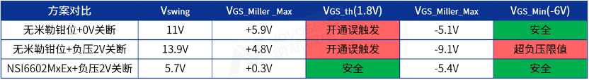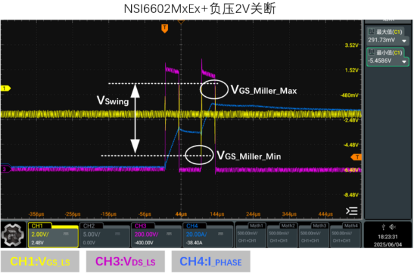 更进一步,对于部分 Ciss/Crss 优化良好的器件,NSI6602MxEx 甚至无需负压,也能实现串扰可控,极大降低系统设计复杂度。