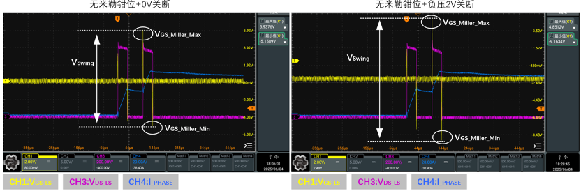 下图展示了某款SiC器件分别搭配NSI6602MxEx和传统无米勒钳位驱动芯片的对比测试结果。在相同驱动参数与layout条件下,NSI6602MxEx能显著抑制正负Vswing,搭配适当负压关断后,可将门极串扰压制至安全范围以内。