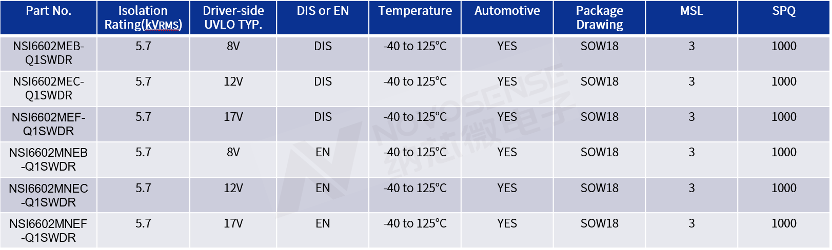 NSI6602MxEx系列提供六种型号可选,具备丰富的使能逻辑配置和驱动电源欠压值规格,灵活适配多种应用场景。
