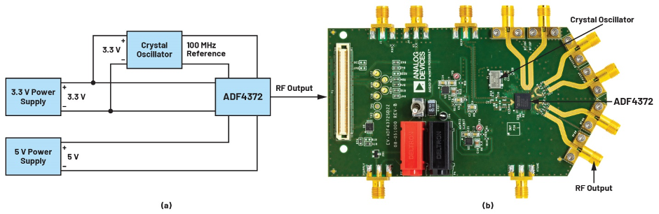 图1.(a) ADF4372的具体电源结构;(b) ADF4372的演示板。