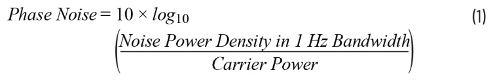 在RF应用中,高性能PLL的性能主要依据一项关键指标予以评估,即相位噪声。相位噪声的计算方式为,将1 Hz带宽范围内的噪声功率相对于主RF信号功率做归一化处理,其详细定义如公式1所示。