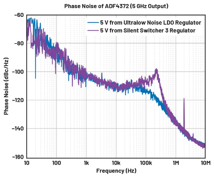 因此,相位噪声始终为负数,其值越低越理想。相位噪声的单位是dBc/Hz,其中c表示该值是根据载波功率进行归一化处理所得。如图1所示,ADF4372需要两条电源轨,分别为3.3 V和5 V。其中,5 V电源轨的敏感度最高,因为它为PLL内部的压控振荡器(VCO)供电。4 在本案例研究中,3.3 V电源始终由超低噪声LDO稳压器(LT3045)供应,而5 V电源则由Silent Switcher 3稳压器驱动,旨在研究Silent Switcher 3稳压器对RF输出信号相位噪声的影响。