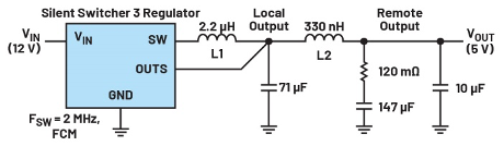为了进一步提升Silent Switcher 3稳压器供电时的相位噪声性能,可以设计并添加一个次级(第二个)LC滤波器至Silent Switcher 3稳压器的输出端。详细的电路图如图 4 所示,其中展示了一个基于Silent Switcher 3稳压器的单级解决方案,使用了第二级LC滤波器为 5 V电源轨供电。配置了第二级LC滤波器后,输出电压的检测既可以在本地输出端进行,也可在第二级 LC 滤波器后的远端输出端完成。本案例中选择在本地输出端检测输出电压,以便简化控制环路的设计。由于高性能PLL的电流消耗较低(通常低于1A),第二级LC滤波器两端的电压降很小,因此仅检测本地输出电压是合理的。因此,选择使用本地输出电容来保证Silent Switcher 3稳压器的稳定运行。然后,根据一般的设计指南建议,远端输出电容应高于本地输出电容,以使系统稳定性对负载电容的敏感度降低。5