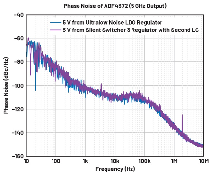 图5.超低噪声LDO稳压器(LT3045)与带第二级LC滤波器的Silent Switcher 3稳压器(LT8625S)在输出5 V电压时的ADF4372相位噪声比较。