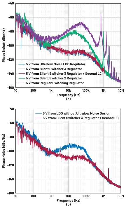 图6.不同电源下PLL时钟(ADF4372)的相位噪声:(a) ADF4372的相位噪声(5 GHz输出);(b) ADF4372的相位噪声(5 GHz输出)。